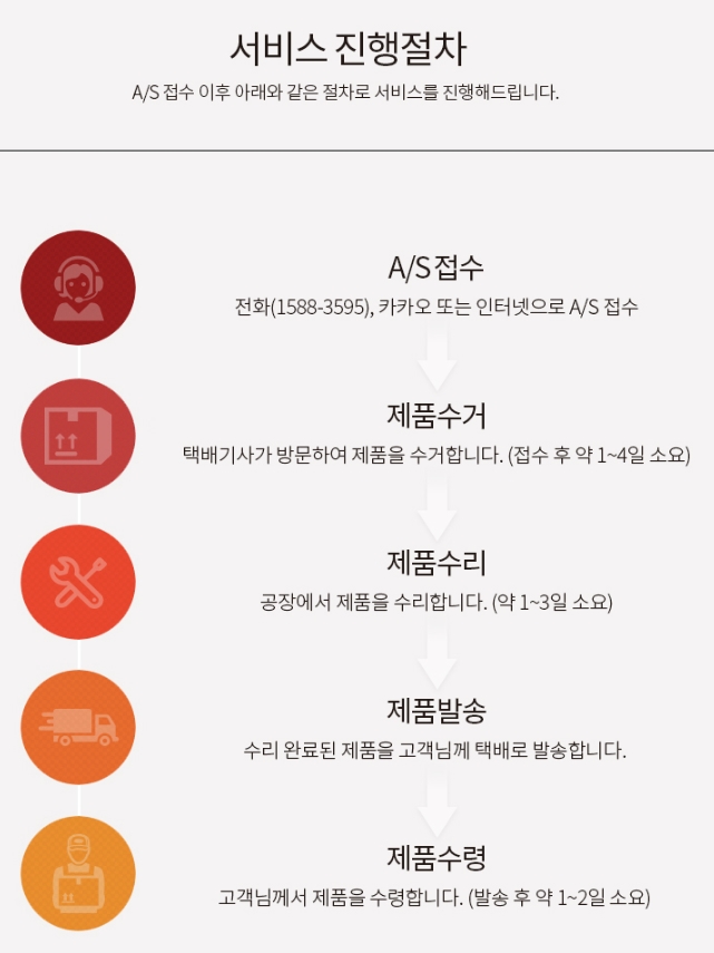 전화나,인터넷으로 AS신청을 하시면 기사가 직접 방문하여 제품을 수거해가고 공장에서 제품 수리 뒤 AS완료된 제품을 수령받아 보실 수 있습니다.