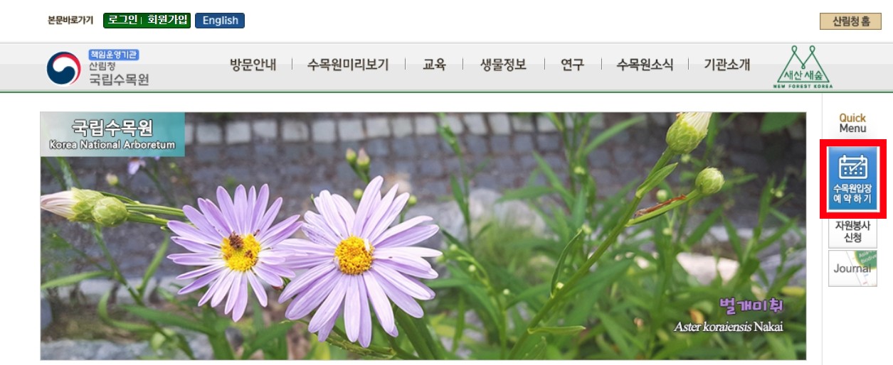 포털사이트에서 '국립수목원' 홈페이이제 접속하신 후 우측상단의 '수목원입장 예약하기'버튼을 누릅니다.