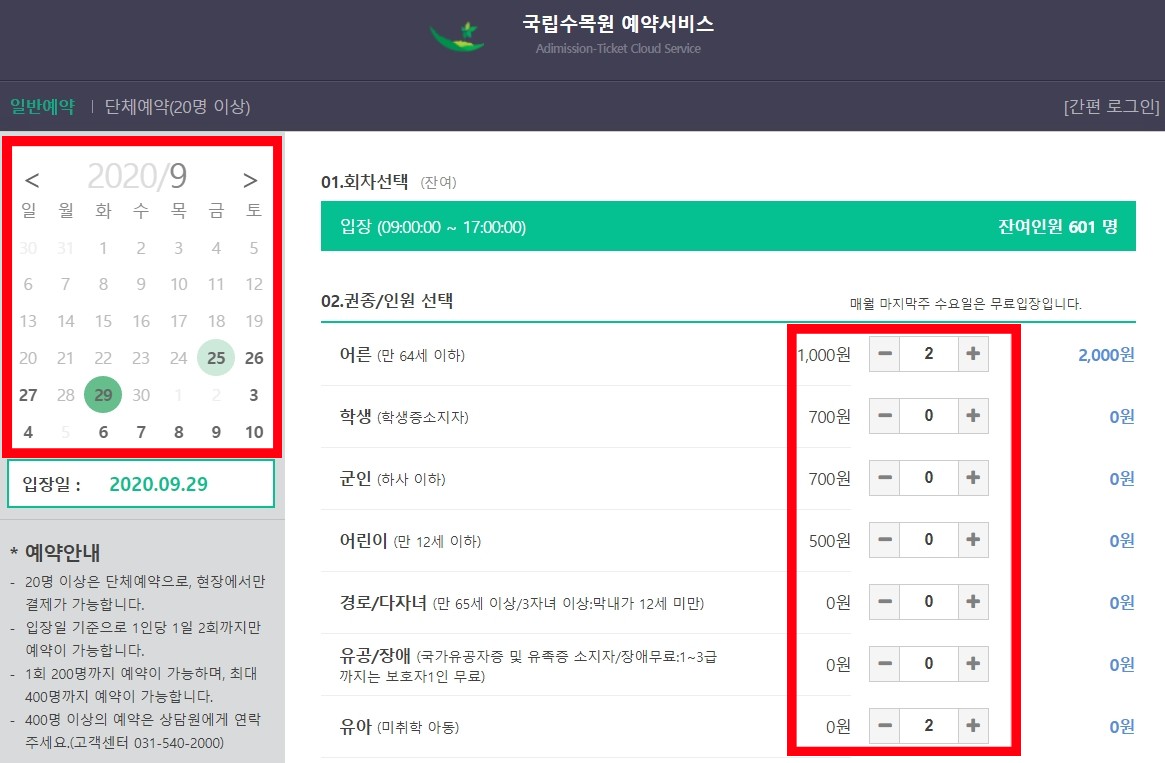 방문하실 날짜와 인원을 선택 합니다.(무료관람인원도 예약은 꼭 해주셔야 합니다.)