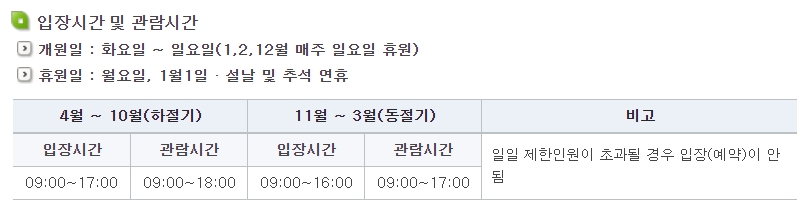동절기(11월~3월): 입장시간 09:00~16:00 (관람시간 09:00~17:00)