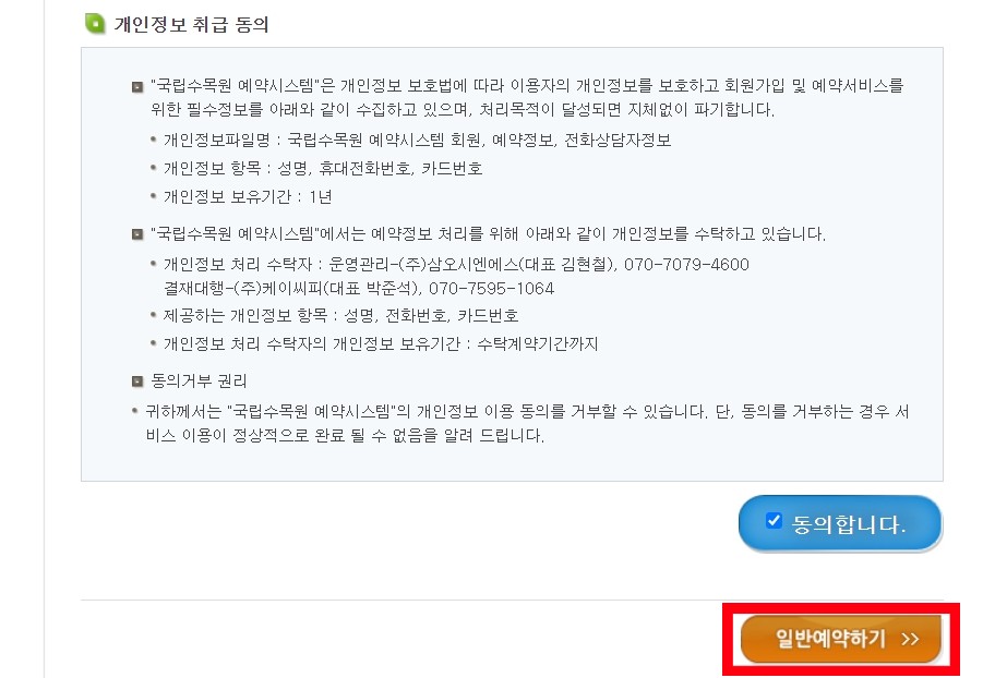 입장관련 안내사항과 다짐 개인정보 취급동의에 체크하시고 '일반예약하기' 클릭합니다.