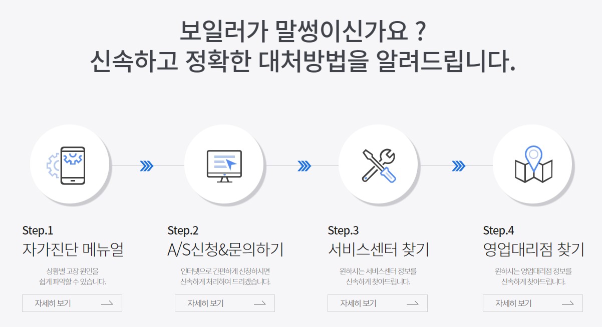 고객센터에 문의하기전 홈페이지에 있는 자가진단 매뉴얼을 통해 상황별 고장원인을 쉽게 파악 해 볼 수 있습니다. 제품종류와 모델명을 알아두면 검색시 빠르게 찾아볼 수 있습니다.