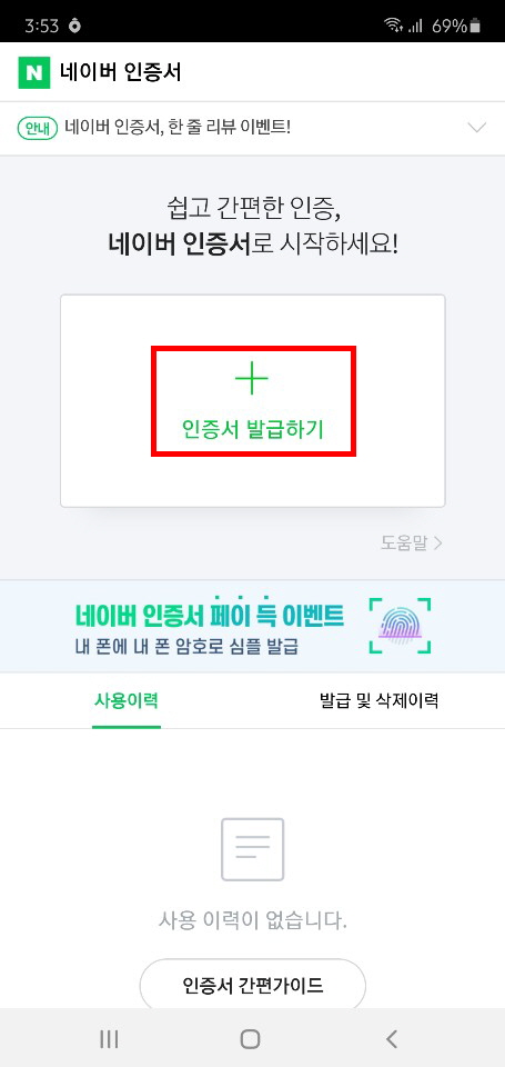 지금 네이버 인증서에 가입하면 네이버 페이를 주는 어플 이벤트도 진행하고 있으니 참여해보시면 좋을 듯 합니다.