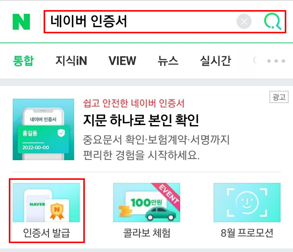 검색창에 '네이버 인증서'라고 검색 후 '인증서 발급' 메뉴를 클릭합니다.
