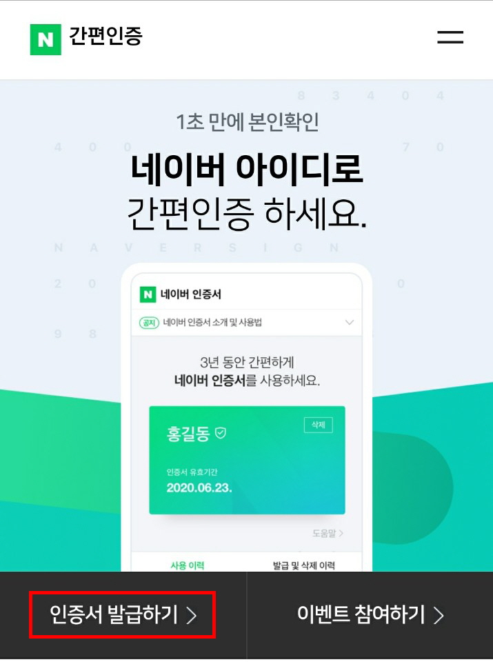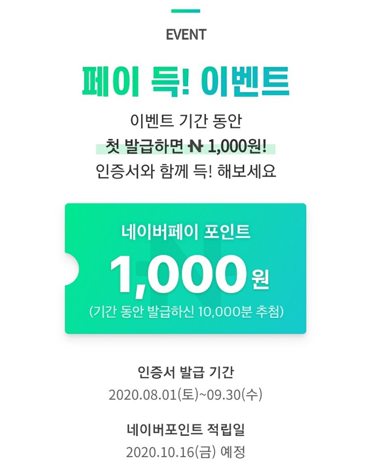 지금 네이버 인증서에 가입하면 네이버 페이를 주는 어플 이벤트도 진행하고 있으니 참여해보시면 좋을 듯 합니다.