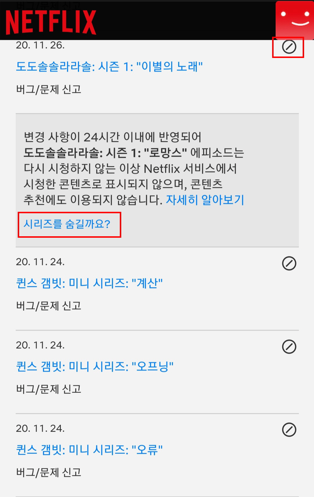 5.시청한 영상 제목 옆의 동그라미에 빗금쳐진 부분을 터치 '시리즈를 숨기까요'를 눌러서 개별 삭제하거나