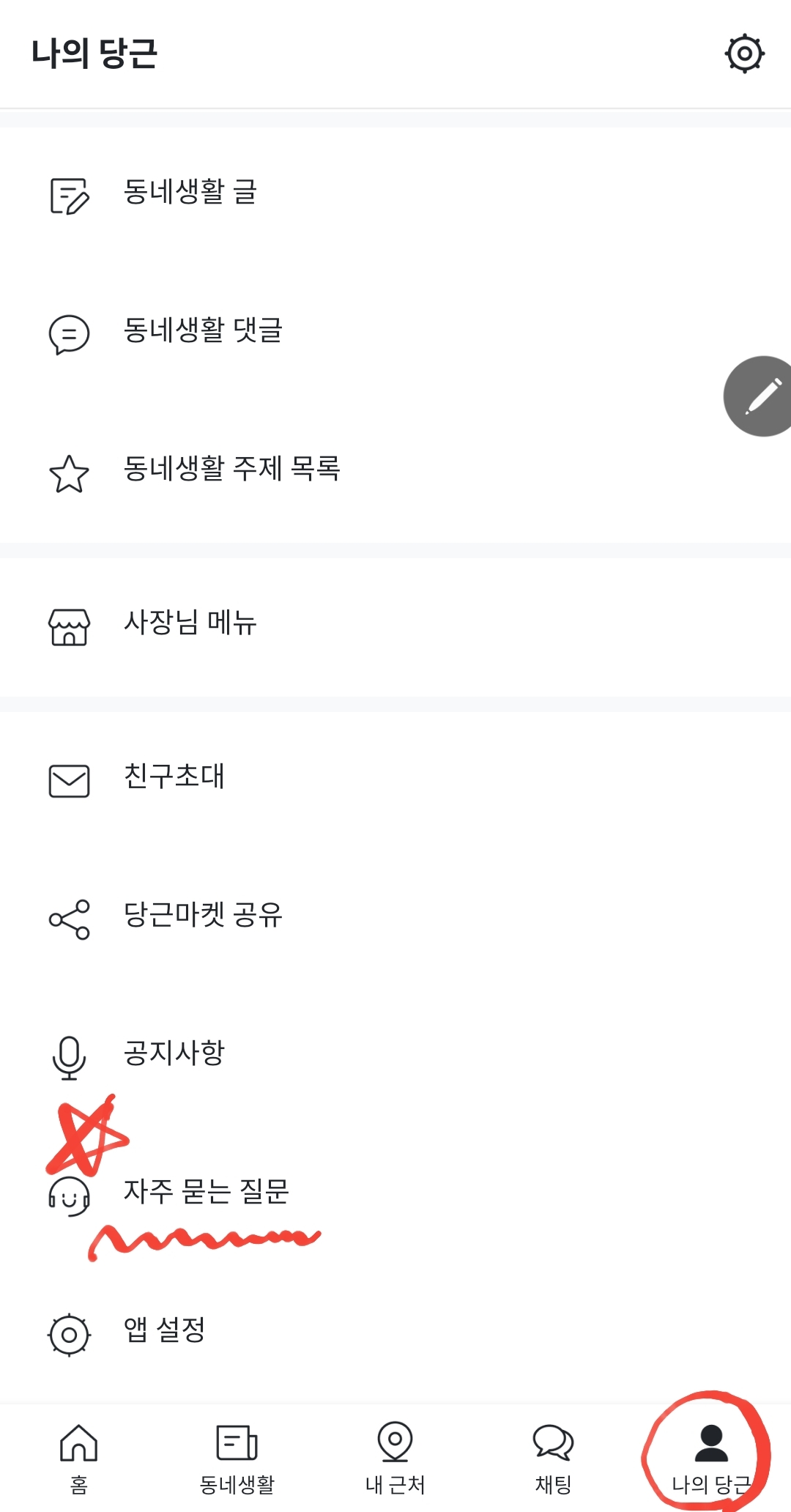 메인 화면의 우측 하단에 [나의 당근]을 누르면 동네인증하기부터 사용에 필요한 메뉴들이 나오구요, 좀 더 아래쪽으로 내리면 [자주 묻는 질문]이 있습니다.