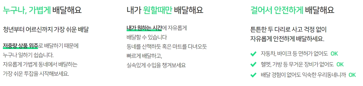 배달시 운송수단 선택의 폭이 넓은 편이며, 가입방법은 앱스토어나 구글플레이스토어 에서 '쿠팡이츠 배달 파트너' 앱을 설치한 후 간단한 동영상을 통한 안전교육을 이수 후 가입이 가능합니다.