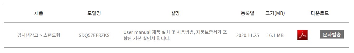 제품사용설명서 자주하는질문 목록 테이블 제품 모델명 설명 등록일 크기(MB) 다운로드 김치냉장고 > 스탠드형 SDQ57EFRZKS User manual 제품 설치 및 사용방법, 제품보증서가 포함된 기본 설명서 입니