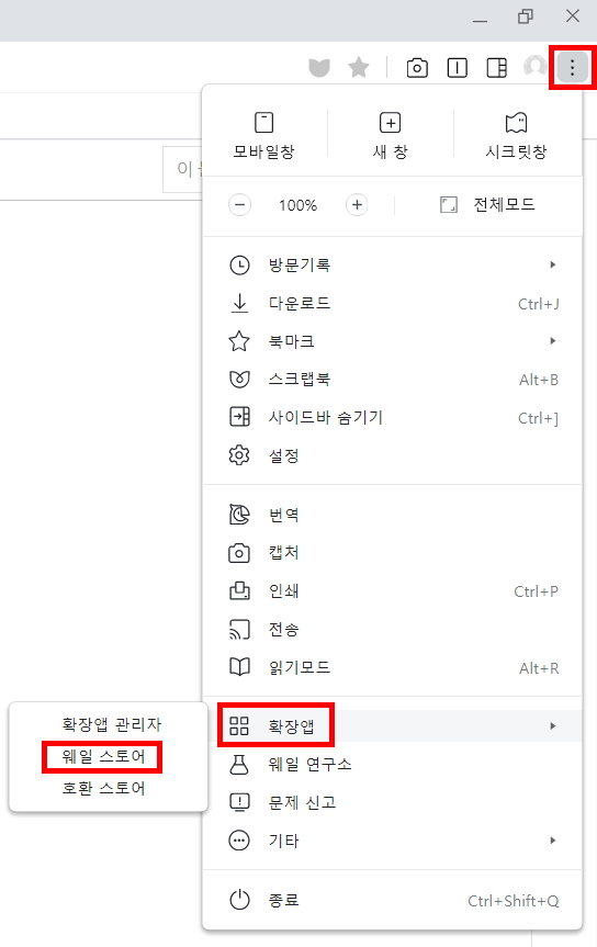 1.웨일브라우저 우측상단에 메뉴버튼을 클릭 후