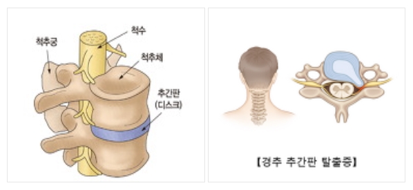우리가 흔히 말하는 목 디스크는 정확한 의학용어로는 “경추 추간판 탈출증”입니다. 디스크(추간판)가 밀려나 주위 신경근을 자극하여 통증을 일으키는 질환입니다.