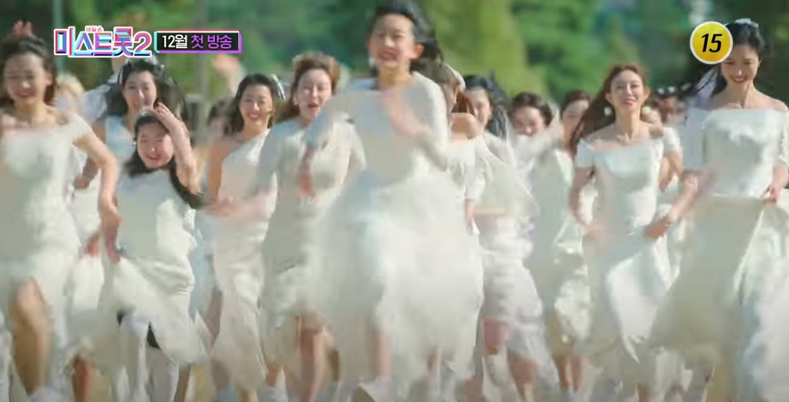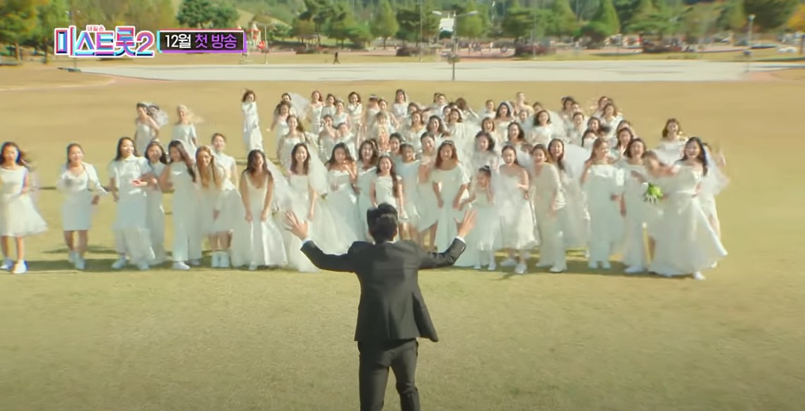 '미스트롯2'가 임영웅과 예심을 통과한 트롯걸 100인과 함께 영화 '청혼'을 패러디해 선보인, 공식 티저 영상에서의 임영웅은 훤칠한 슈트를 입고 보타이까지 갖춰 매고 쫓기는 듯 가쁜 숨을 몰아쉬며 달음박질치는 모습에서 시작된다.