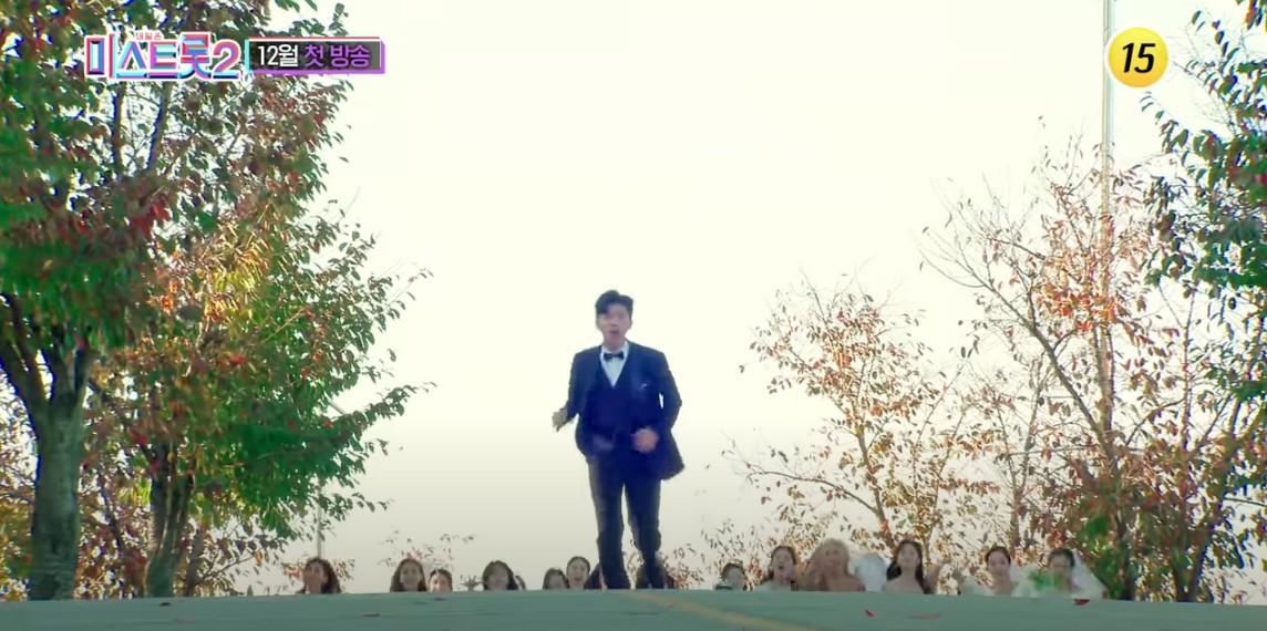 '미스트롯2'가 임영웅과 예심을 통과한 트롯걸 100인과 함께 영화 '청혼'을 패러디해 선보인, 공식 티저 영상에서의 임영웅은 훤칠한 슈트를 입고 보타이까지 갖춰 매고 쫓기는 듯 가쁜 숨을 몰아쉬며 달음박질치는 모습에서 시작된다.