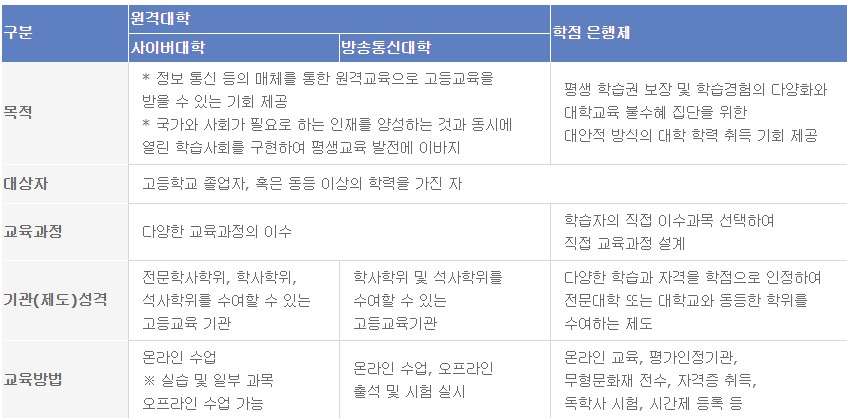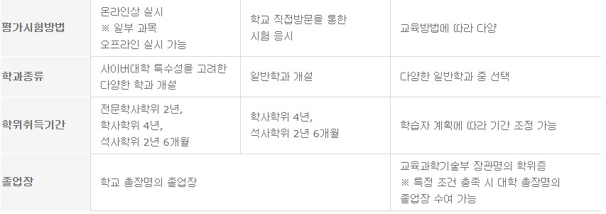 사이버대학,학점은행제,방송통신대학교 차이점