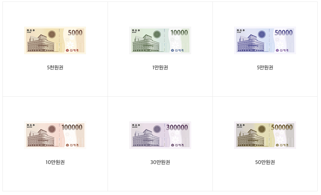 신세계 상품권은 5천원,1만원,5만원,10만원,30만원,40만원 총 6가지 금액권이 있습니다.