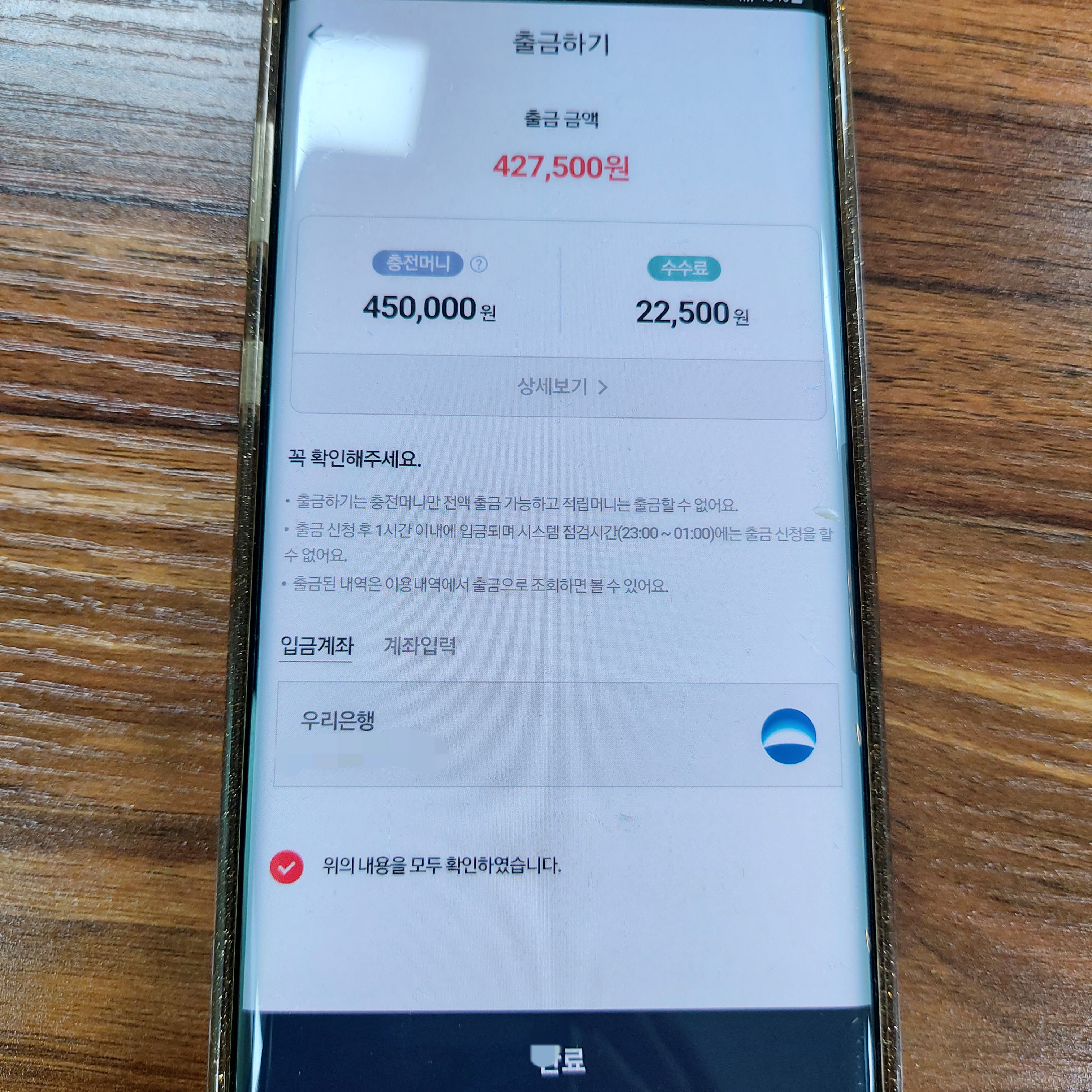 받을 계좌번호를 입력하면 30분~한시간 뒤 입력한 계좌로 입금 받을 수 있습니다. (수수료5% 공제)