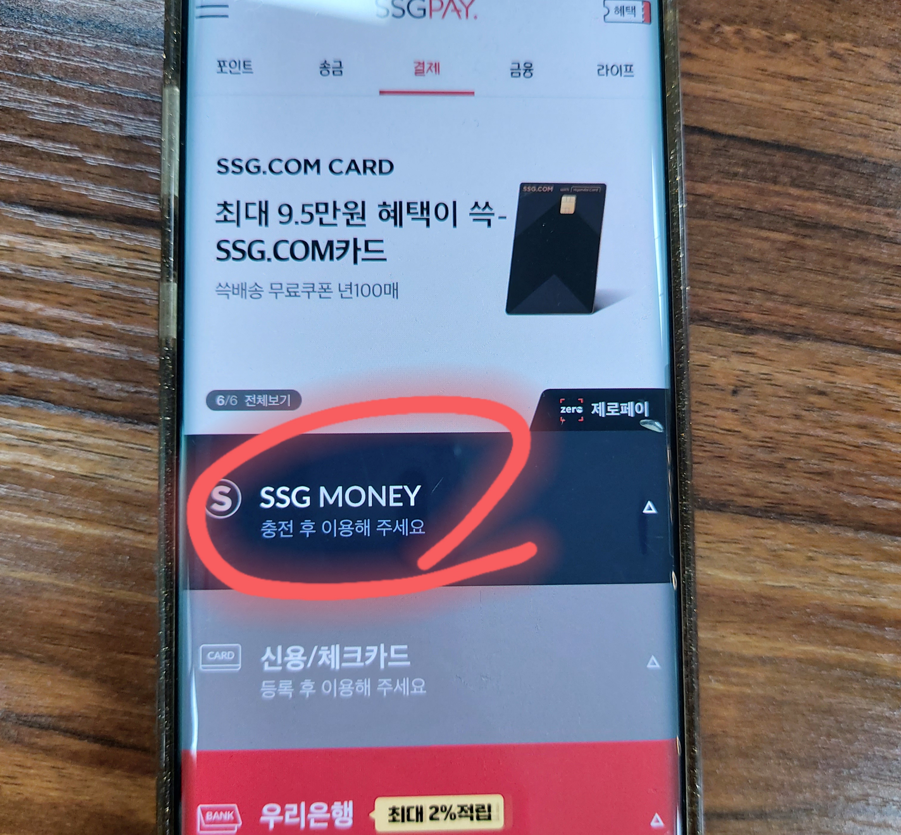 2. 상단 메뉴 “결제”에서 SSG MONEY에서 '충전'을 눌러주세요.
