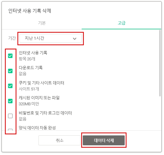 '비밀번호' '자동완성 데이터'는 로그인되었던 아이디 비밀번호등 저장된 기록까지 삭제되기 때문에 확인 후 필요에 따라 삭제 합니다.