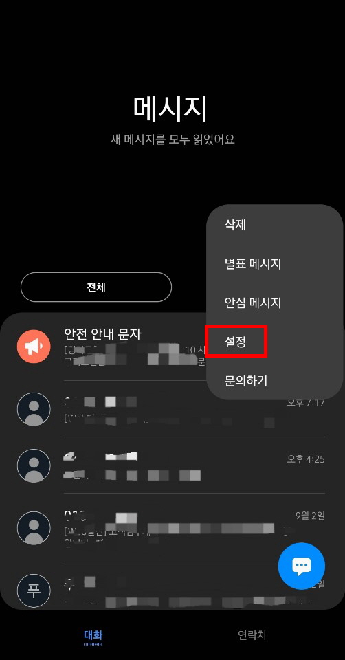 1. 메시지 창을 열어서 아래 빨간네모 부분의 점세개 버튼을 눌러주시고-설정을 눌러주세요