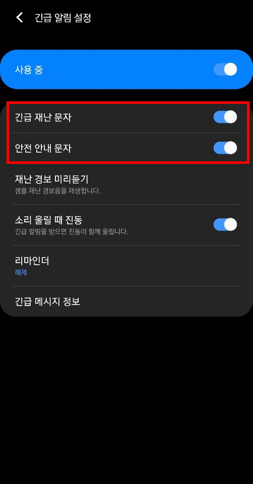 재난문자는 안전을 위해서 발송되는 메세지이니 가급적이면 살짝 불편하더라도 끄지 않는 걸 추천드립니다.