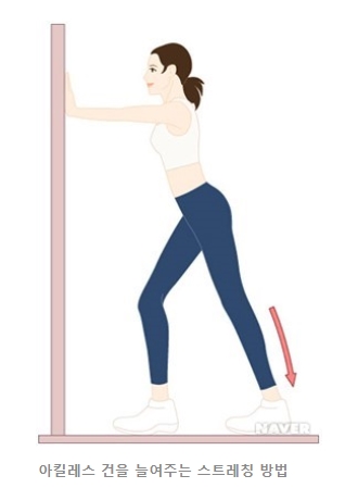 아킬레스 건에 대한 스트레칭은 벽에서 30cm 가량 떨어져서 벽을 바라보고 선 채로 통증이 있는 쪽의 다리를 최대한 뒤쪽으로 뺀 상태에서 발바닥 전체로 바닥을 디디면서 벽을 양손바닥으로 밀어서 종아리의 아킬레스 건이 단단하게 스트레칭을 해줍니다.