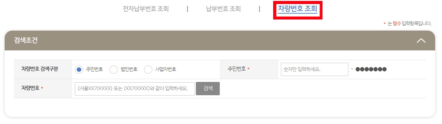 전자납부번호나 납부번호 조회보다는 아무래도 차량번호 조회가 쉽기 때문에 검색조건을 '차량번호 조회'로 하고 주민번호 앞자리와 차량번호를 입력 합니다.