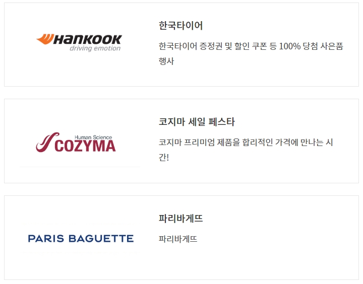 파리바게뜨 케이크 및 카스텔라, 배스킨라빈스 아이스크림 케이크 및 레디팩, 던킨먼치킨팩 등 해피콘(모바일 쿠폰) 8종을 20% 혜택이 적용된 가격으로 판매하며. 또 삼립호빵, 던킨 캡슐커피 등을 비롯해 가습기, 그릇 등 유명 브랜드 생활용품 30여 종도 최대 94% 저렴한 혜택으로 만나볼 수 있습니다.