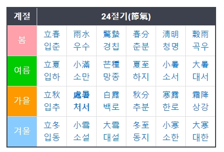 24절기의 하나인 처서는 2020년 기준 양력 8월 23일(음력7월5일) 입니다. 여름이 지나면 더위도 가시고 선선한 가을을 맞이하게 된다는 의미로, 더위가 그친다는 뜻에서 붙여진 이름입니다.