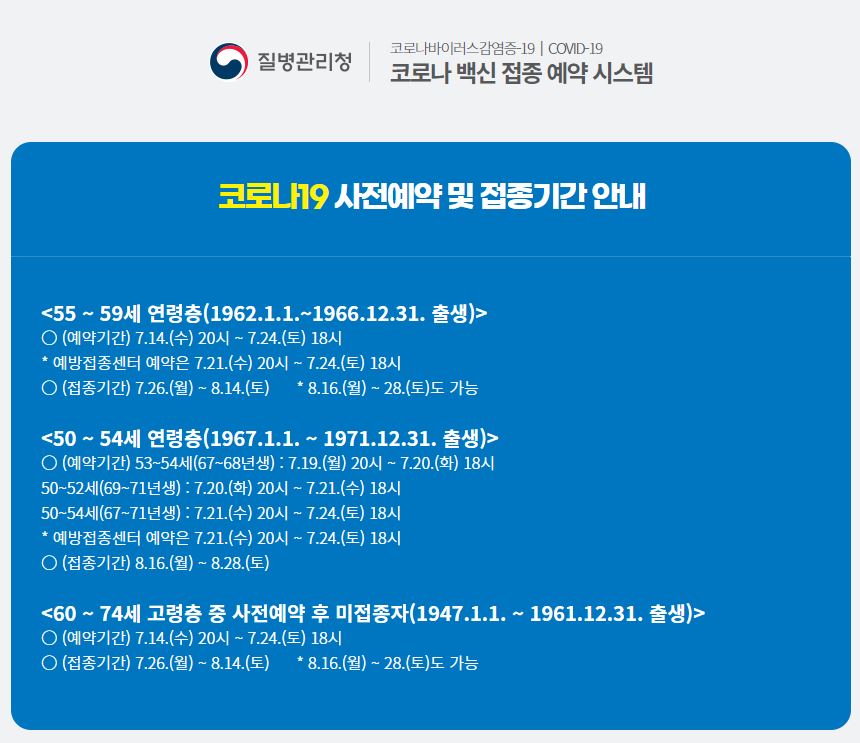 53세와 54세(1967년~1968년생)를 시작으로 20일 오후 8시에는 50~53세(1969~1971년생)의 예약이 진행됩니다. 모레부터 24일 18시까지는 50대라면 누구나 예약할 수 있습니다.