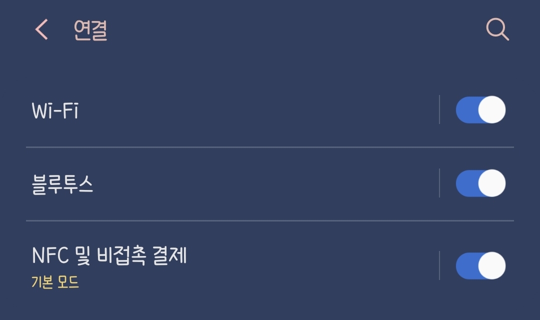 혹시나 상단 메뉴바에서 찾기 어려우신 분들은 설정-연결로 가시면 블루투스 아래 "NFC 및 비접촉 결제" 메뉴를 통해서