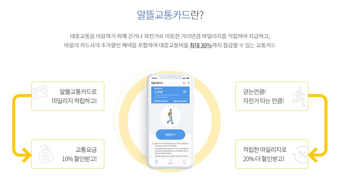 대중교통을 이용할 때 정류장과 도착지 등 걷거나, 자전거로 이동한 거리에 따라 마일리지를 적립받고 추가로 카드사 추가 할인 혜택도 받을 수 있습니다. 최대 30%의 교통비를 아낄 수 있는 카드입니다.