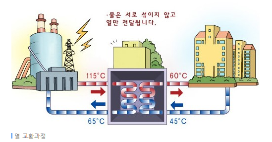 공급된 중온수가 열교환기를 통하여 건물 내의 물로 열을 전달해 주고 그렇게 데워진 온수가 각 세대로 연결된 배관을 통하여 난방수 및 급탕수로 최종 공급됩니다.